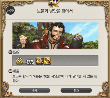 퀘스트 명은 "보물과 낭만을 찾아서"이다.